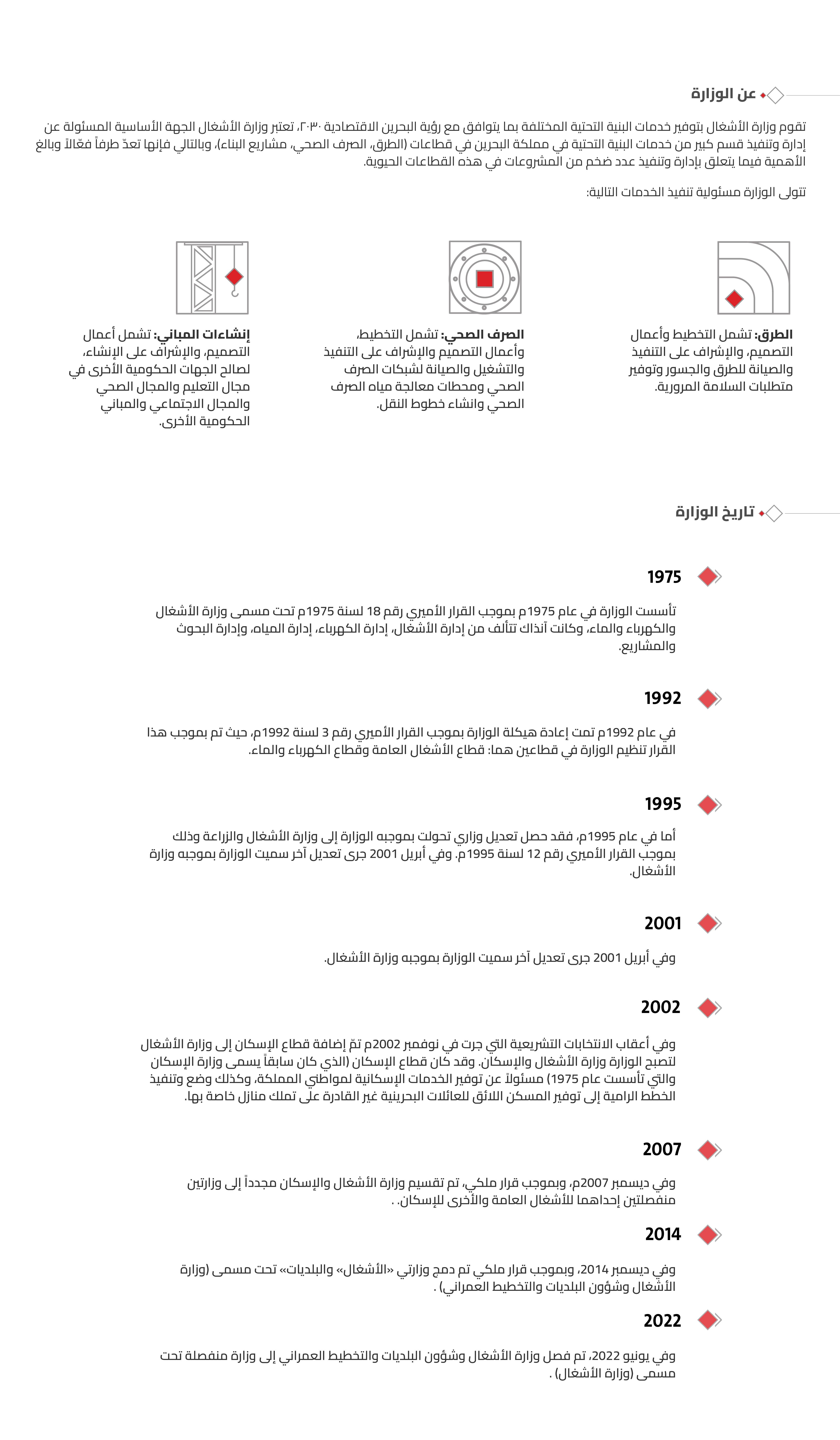 تقوم وزارة الأشغال بتوفير خدمات البنية التحتية المختلفة بما يتوافق مع رؤية البحرين الاقتصادية 2030، تعتبر وزارة الأشغال الجهة الأساسية المسئولة عن إدارة وتنفيذ قسم كبير من خدمات البنية التحتية في مملكة البحرين في قطاعات (الطرق، الصرف الصحي، مشاريع البناء)، وبالتالي فإنها تعدّ طرفاً فعّالاً وبالغ الأهمية فيما يتعلق بإدارة وتنفيذ عدد ضخم من المشروعات في هذه القطاعات الحيوية.