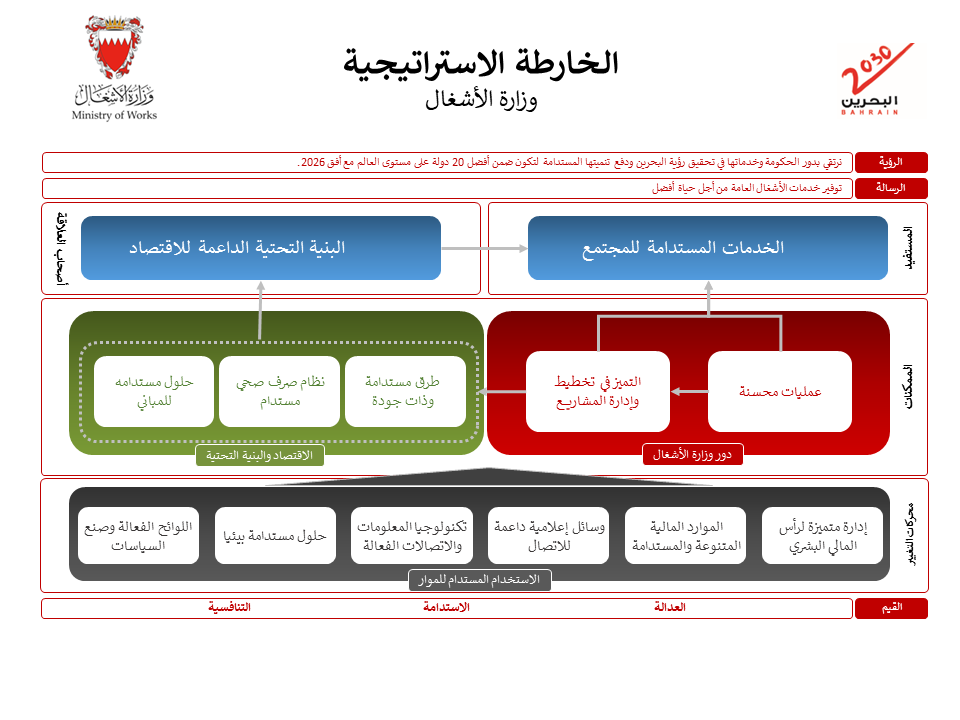 يتم تطوير الأهداف الاستراتيجية بالتفصيل ودعمها من قبل مؤشرات الأداء الاستراتيجية الرئيسية والمبادرات الاستراتيجية. والتي تتماشى مع رؤية البحرين 2030. مالكو أعضاء فريق الاستراتيجية مسؤولون عن تنفيذ الاستراتيجية وتقديم تقارير عن أداء استراتيجيتهم على فترات ربع سنوية.